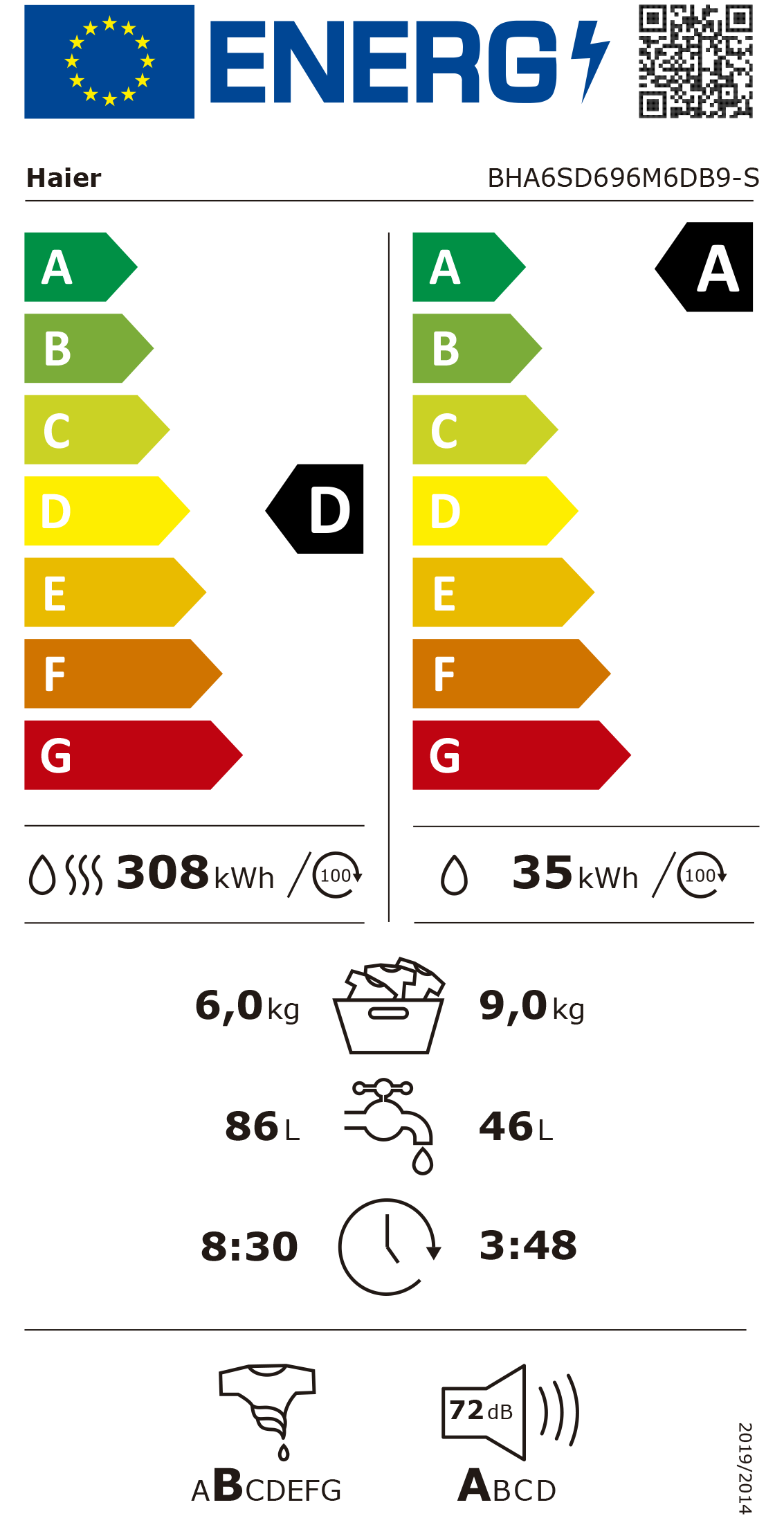 Capacidade de lavagem algodão (kg): 9 Capacidade de secagem de algodão (kg): 6 Velocidade máxima de centrifugação (rpm): 1600 Encastre CARACTERÍSTICAS TÉCNICAS App IoT: hOn Conectividade: Controlo remoto avançado e conteúdos (Wi-Fi + BLUETOOTH®) Eletrónico: Visor de 6 dígitos Motor: Inverter BPM Tipo de ficha: Schuko Voltagem (V): 220-240 PROGRAMAS E FUNÇÕES Número de programas: 15+1 Opções de início diferido: (até 24h) Características principais: Mix Power System Autodose Vapor ESTÉTICA Cor do corpo: Branco Cor/Material da porta: Preto DESEMPENHOS E CONSUMOS Classe de eficiência energética EEI (lavagem): A Classe de eficiência energética EEI (Lavagem e secagem): D Classe de eficiência de centrifugação: B Consumo de energia ponderado [100 ciclos (lavagem)]: 35 Consumo de energia ponderado [100 ciclos (lavagem e secagem)]: 308 Eco 40-60 Duração (lavagem+secagem): 228 Duração de lavagem e secagem completa: 510 Classificação energética do nível de ruído na centrifugação EN 60704-4: 72 Classe de emissão de ruído acústico aerotransportado: A Consumo de água na lavagem: 46 Consumo de água (lavagem+secagem): 86 DIMENSÕES Altura do produto (mm): 820 Largura do produto (mm): 600 Profundidade total do produto (mm): 525